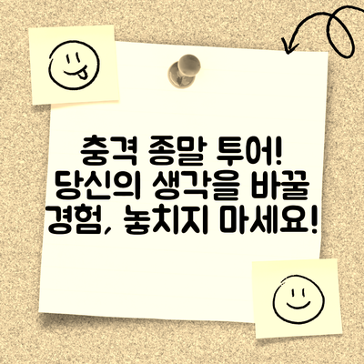 종말 투어링을 통해 여러분은 익숙한 틀을 깨고 새로운 경험을 쌓으며, 나 자신을 다시 발견할 수 있는 기회를 가지게 될 것입니다. 더이상 고민하지 마세요, 도전하는 것이 여러분의 삶을 변화시킬 수 있습니다!